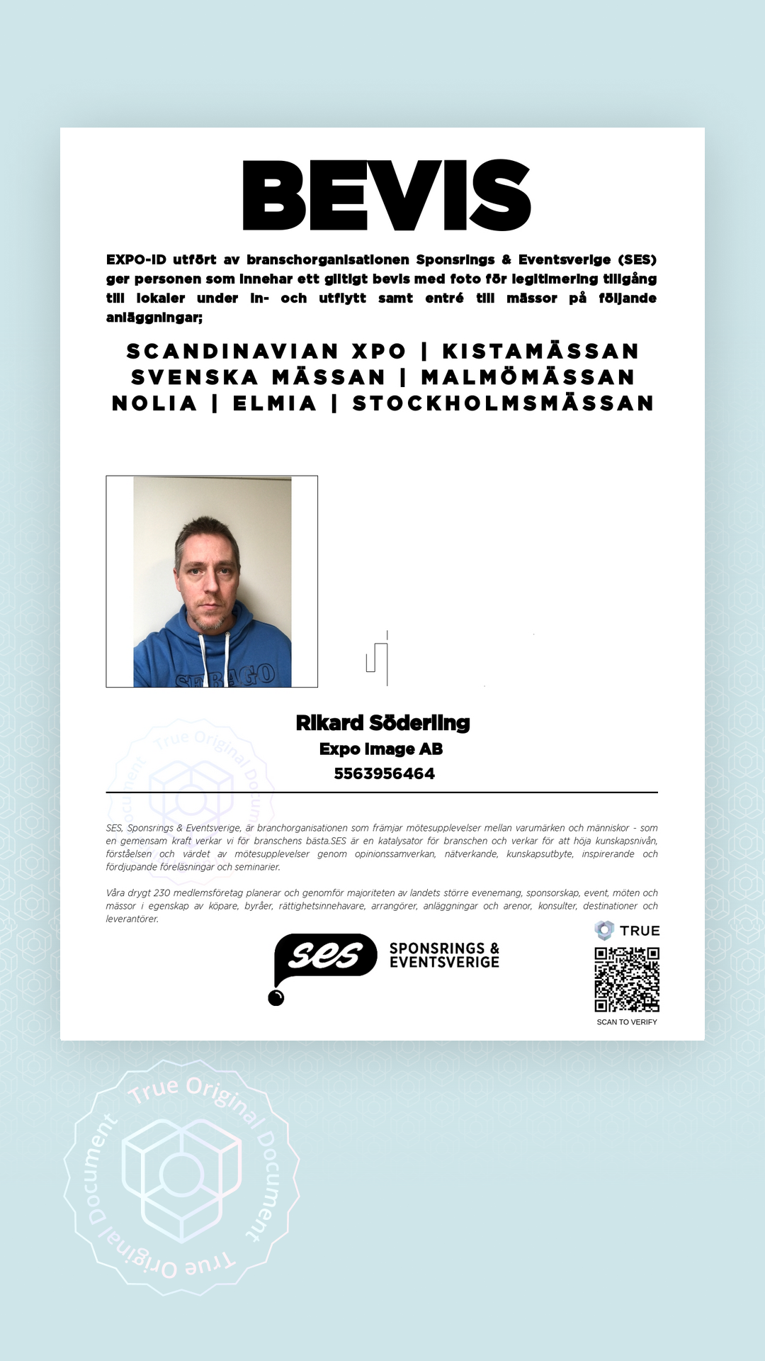 Detta EXPO-ID är utfört av branschorganisationen Sponsrings & Eventsverige (SES) och ger personen som innehar ett giltigt bevis med foto för legitimering tillgång till lokaler under in- och utflytt samt entré till mässor under 2023 på följande anläggningar;