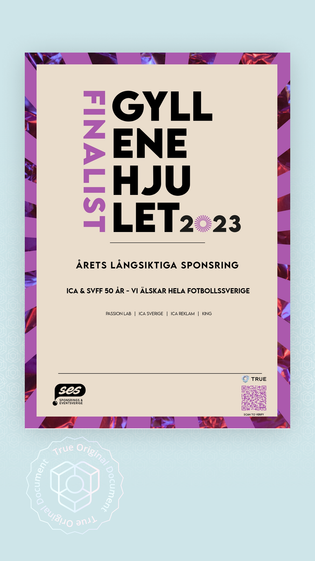 Alla TRUE -dokument är säkrade med blockchainteknologi och kan därför alltid verifieras som äkta. Vem som helst kan verifiera ett dokument genom att klicka på verifieringsknappen på det publicerade dokumentet, eller skanna QR-koden på en utskriven kopia. Ingen app eller 3:e part krävs – bara en smartphone-kamera.